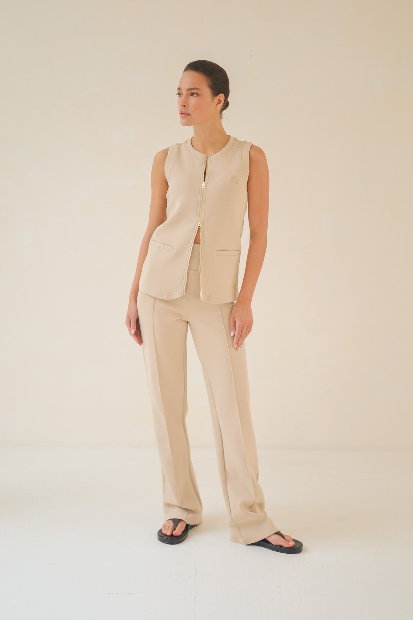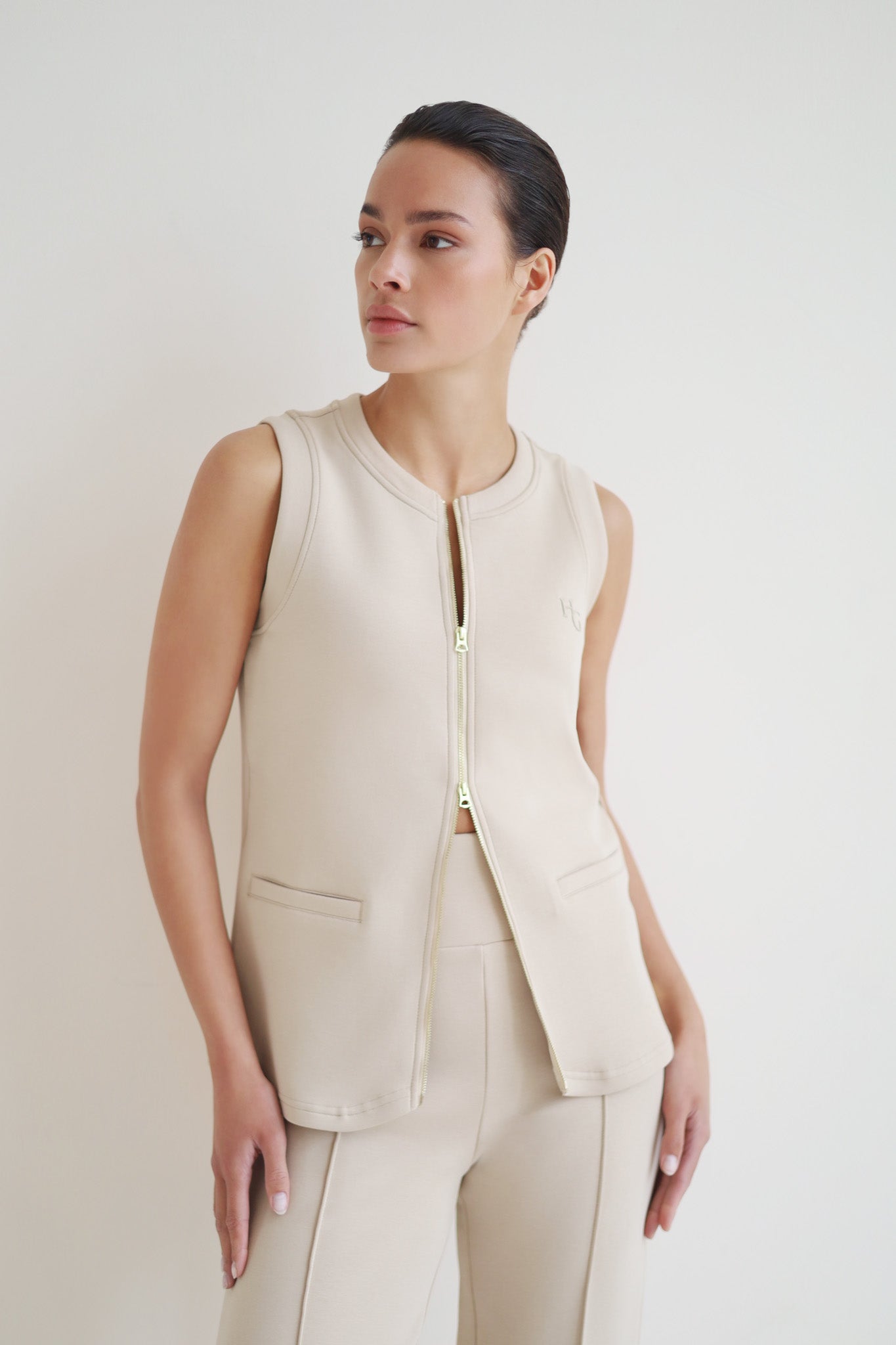 The Tailored Zip Spencer is made from our smooth, soft and luxurious daywear fabric. A timeless classic with a relaxed silhouette. It has a small embroidery on the front and high-end finishing. Wear it in the city with the matching tailored trouser and track pants or polish up your activewear on the way to the gym.